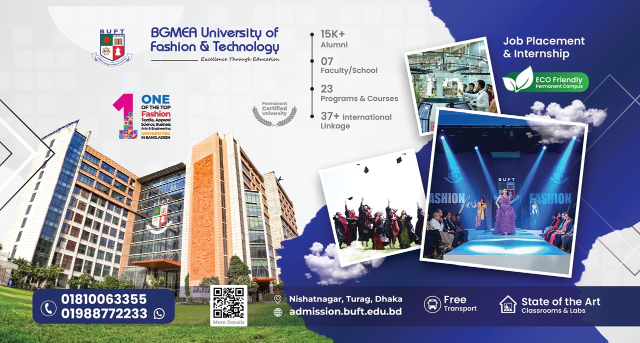 BGMEA University of Fashion & Technology (BUFT) was set up in March 2012 under the Private Universities Act of 2010 and is dedicated to the development of human resources for the readymade garment, textile and allied sectors of Bangladesh. The university aims to establish itself as a ‘center of excellence’ for study, research and development and to serve the nation.
